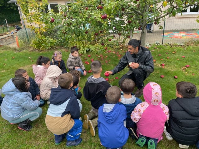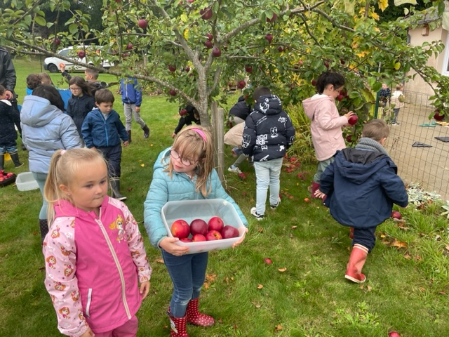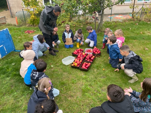 Nous avons ramassé les belles pommes de nos pommiers. Nous les avons triées : celles qui étaient un peu abimées dans une caisse, celles qui n’étaient pas abimées du tout dans une autre, puis celles qui se décomposaient dans un coin afin que les oiseaux et autres petites bêtes puissent venir se servir !