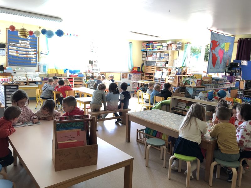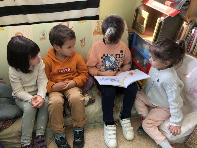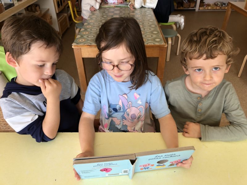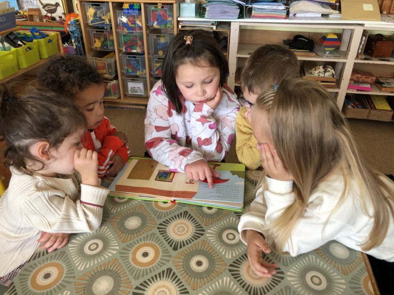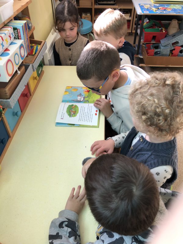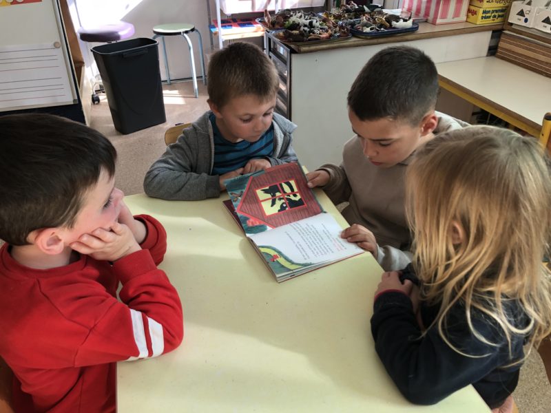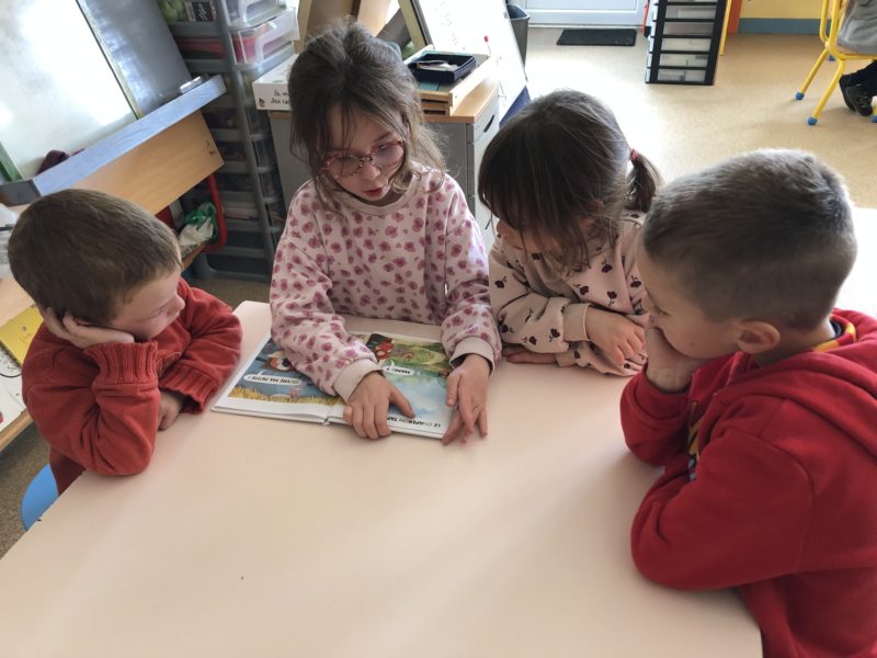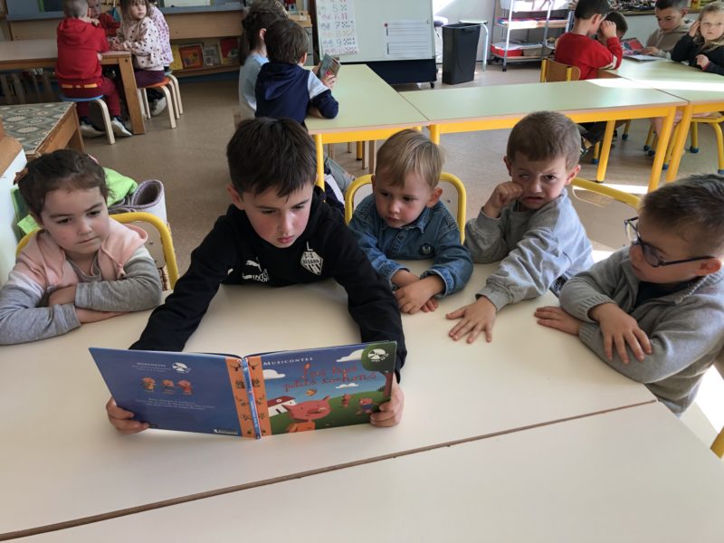 Tous les lundis, nous avons un temps dédié à l’écoute d’histoires soit avec des mamies à la bibliothèque, soit avec des élèves de primaire. Les CE1 mettent leurs compétences de lecteur au service des maternelles. Ainsi ces rendez-vous valorisent la coopération entre grands et petits, les apprentissages liés à la lecture ( les CE1 préparent très sérieusement leur lecture) et la culture littéraire. Tout un programme… Merci et bravo les grands !
