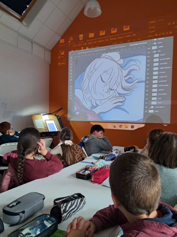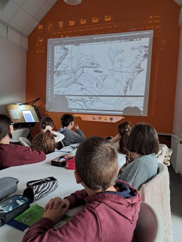 Puis, elle nous a présenté les différentes étapes de travail sur une planche de l’album Sorceline. Elle nous a parlé du détourage, qui est un travail long et précis, du travail sur les ombres et la lumière.