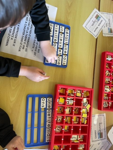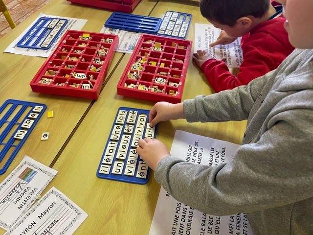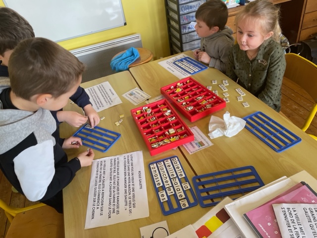 En production d’écrit, les élèves ont écrit une histoire, sous la dictée à l’adulte. Maintenant, ils doivent écrire l’histoire avec des lettres mobiles en script.