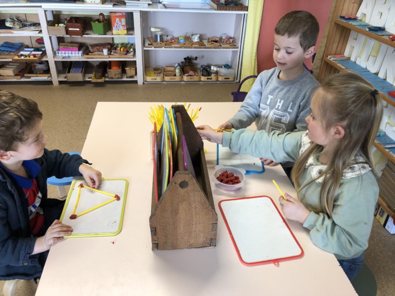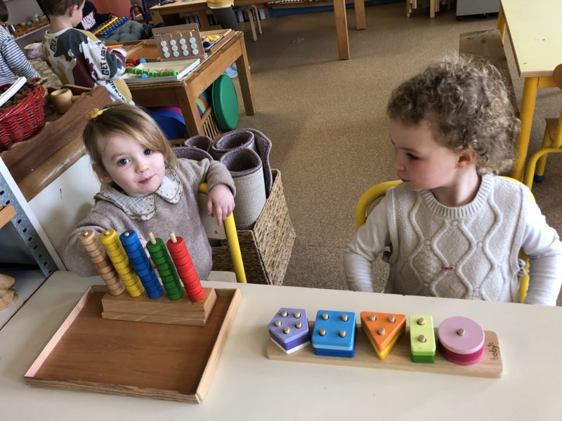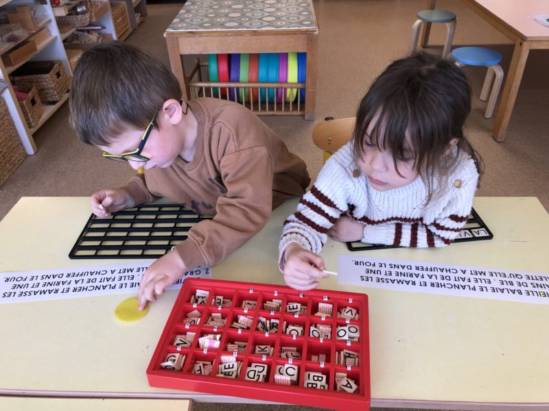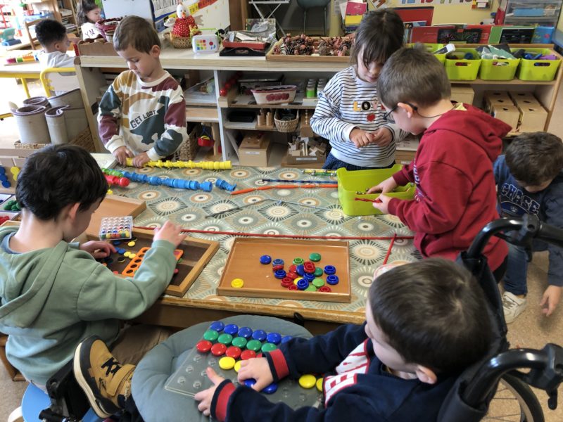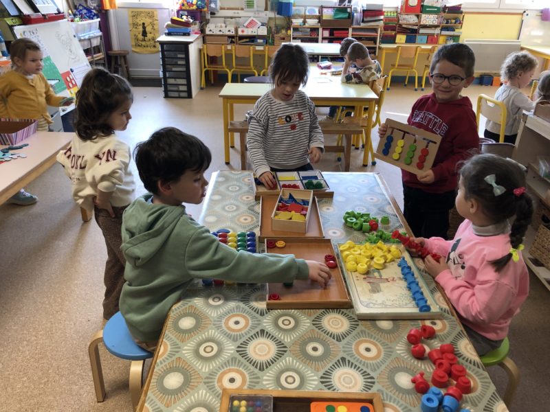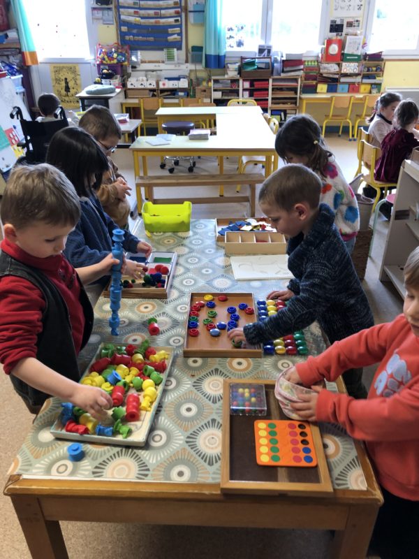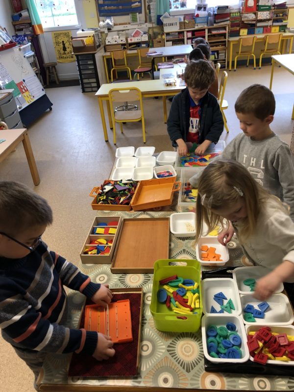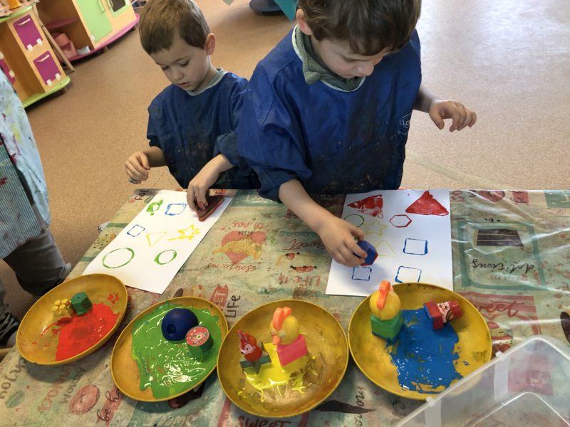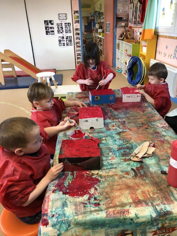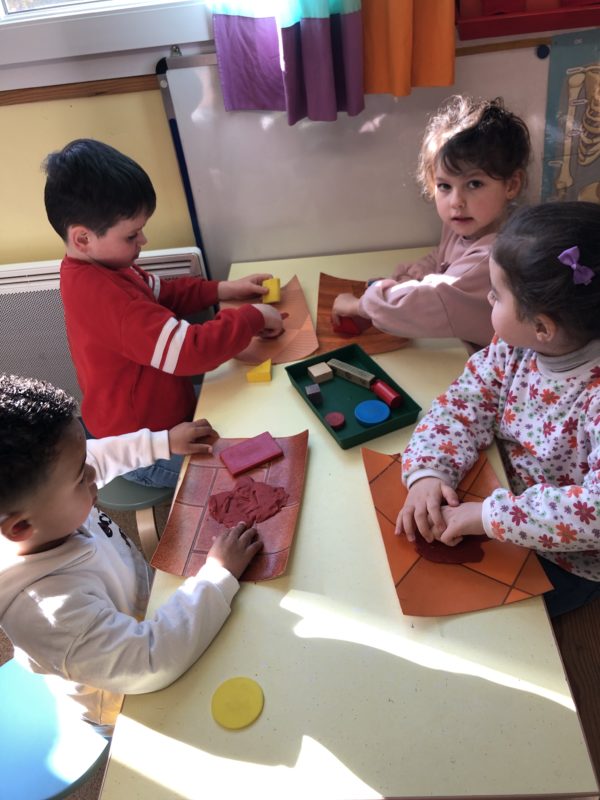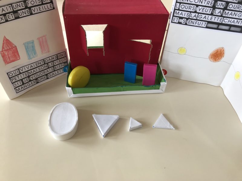 Pendant cette période, nous avons axé nos jeux et nos activités sur les formes et les couleurs : trier les pièces, faire des empreintes, créer des formes … Après ces manipulations, nous avons imaginé le conte de « Roule galette » dans une version géométrique : l’ours est ovale, le loup un grand triangle … Chacun a fabriqué sa boîte pour mettre en scène l’histoire et les plus grands ont même fabriqué leur premier livre : écriture des textes, illustrations … Du grand et beau travail !