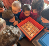 Vendredi 12 mai, nous avons installé une couveuse en classe. Nous y avons déposé 14 oeufs de poule. Nous avons expliqué à quoi sert une couveuse, comment cela fonctionne… Nous avons remarqué que les oeufs n’ont pas tous la même couleur, ni exactement la même taille… Nous attendons avec impatience la naissance des poussins…!