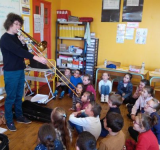 Nous avons commencé nos séances de musique en CE. Avec Elisabeth, nous avons découvert la musique africaine. On a également joué du trombone et de la trompette. Nous commençons à apprendre des chansons pour le spectacle aussi…